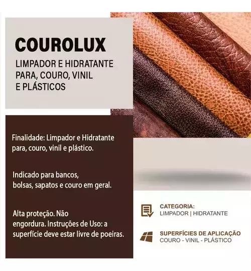 Limpador e Hidratante para, couro, vinil e plástico. Indicado para bancos, bolsas, sapatos e couro em geral. Alta proteção. Não engordura.