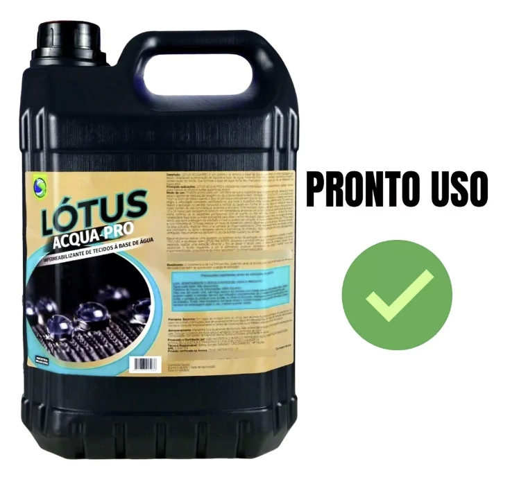 Produto pronto para uso. Certifique-se que a superfície que receberá a aplicação deverá estar limpa, seca e isentas de residuais de lavagem ou da própria indústria têxtil. Aplique LÓTUS ACQUA-PRO a uma distância de 15 a 20 cm do tecido usando bico de jato leque pressão em 3 psi se houver manômetro, realizando movimentos largos e velocidade constante, certificando-se que toda a superfície seja coberta uniformemente. De preferência, realize aplicação no sentido horizontal e vertical do tecido em forma de xadrez. Aplicar um reforço em áreas de maior contato de uso como braços, assentos e encostos. Evite excessos. Após a aplicação realizar uma pausa de até 12 a 24 horas para a secagem do produto em temperatura ambiente (recomendamos usar aceleradores de secagem como turbinas de ar, secadores profissionais com ar quente ou frio em dias chuvosos e úmidos). Se houver necessidade faça duas ou mais aplicações para obter melhor resultado, aguardando o tempo de secagem entre elas, sendo que após a secagem do estofado o mesmo poderá ser utilizado. A cura completa é obtida com 72 horas após a última aplicação (em tecidos de algodão cru o tempo de penetração do líquido é maior que outros tecidos). Após a cura completa de 72 horas, realizar um teste de repelência usando algumas gotículas de água. Se houver absorção na área aplicada, reaplicar mais uma camada de impermeabilizante. Uma reaplicação deverá ser realizada sempre que necessário, ou após o desgaste natural e ineficiência da proteção, faça a aplicação em áreas adequadamente ventiladas