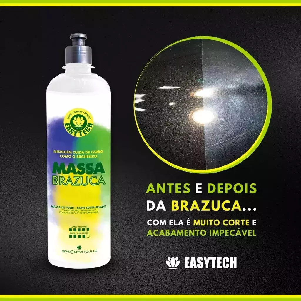 A Massa de polir Brazuca inaugura uma nova classe de massas no Brasil. As massas com um poderoso poder de corte, sem pó e com um acabamento digno de compostos polidores. Tudo pensado para fazer o profissional de estética automotiva ganhar tempo. O poder de corte, remoção de riscos e nivelamento de texturas impressiona. Extremamente eficiente em qualquer tipo de verniz, dos mais macios aos mais duros e complexos. Uma massa de polir que evoluiu com o mercado de estética, que precisa de melhores produtos e melhores preços. Produzida com um blend de grãos de Alúmina Calcinada de extrema pureza que pertimem atender desde repinturas, vernizes cerâmicos a vernizes extremamente macios. Altamente lubrificada e sem geração de pó.