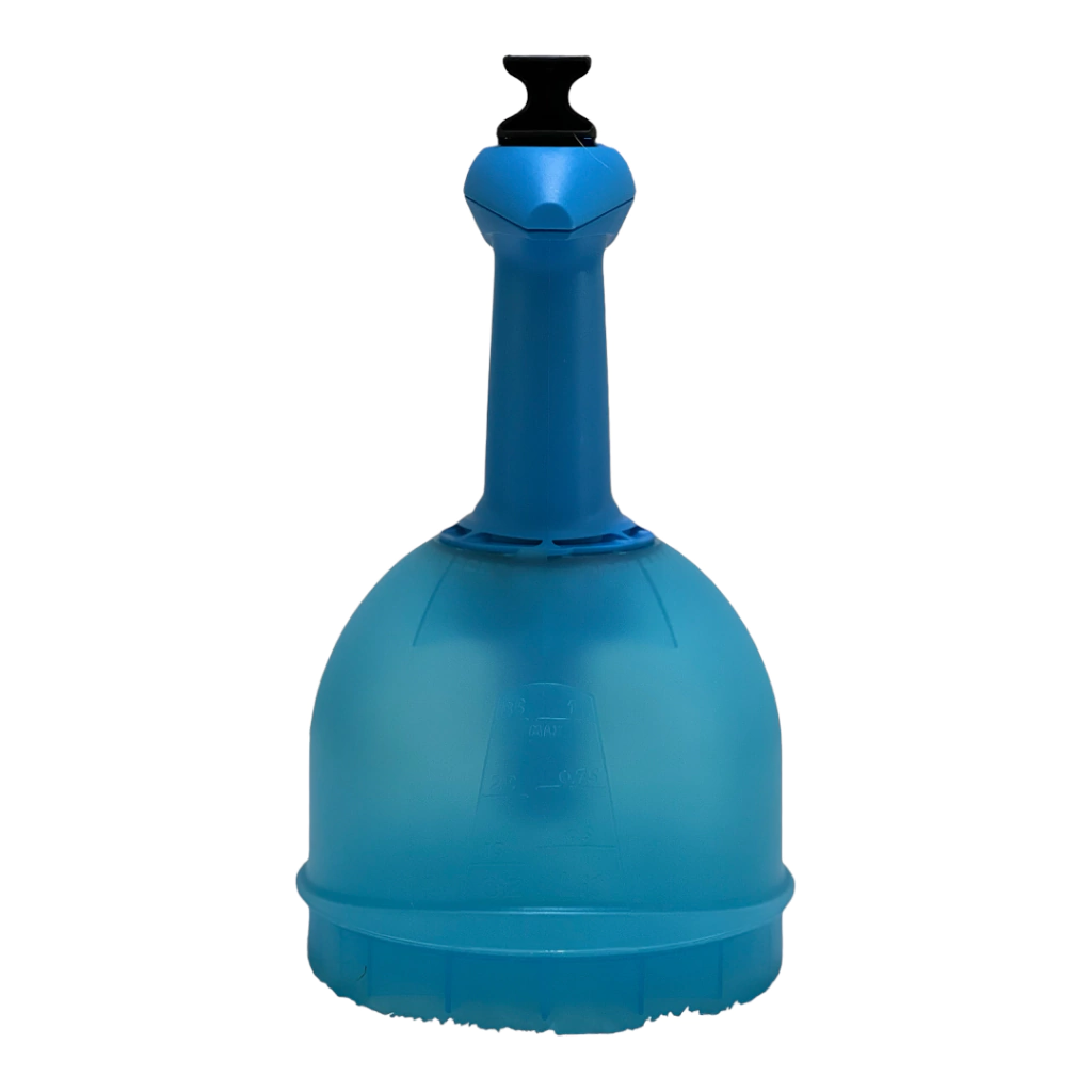 Pulverizador com pressão prévia com capacidade 1 litro, com empunhadura ergonômica e depósito translúcido para visualização do nível de líquido.